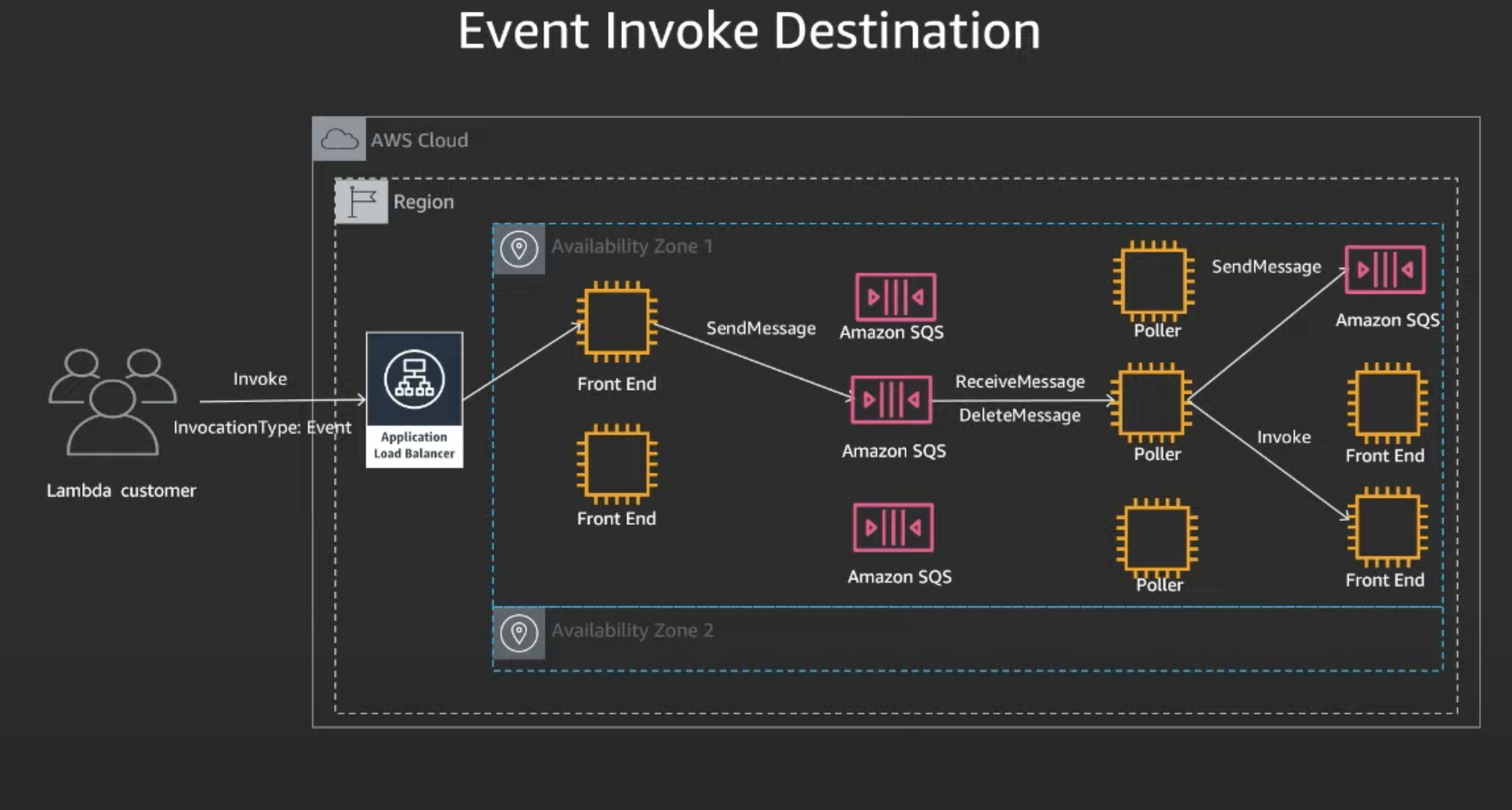 - Lambda customer calls "invoke",which hits Application Load Balancer that routes to the Front End.