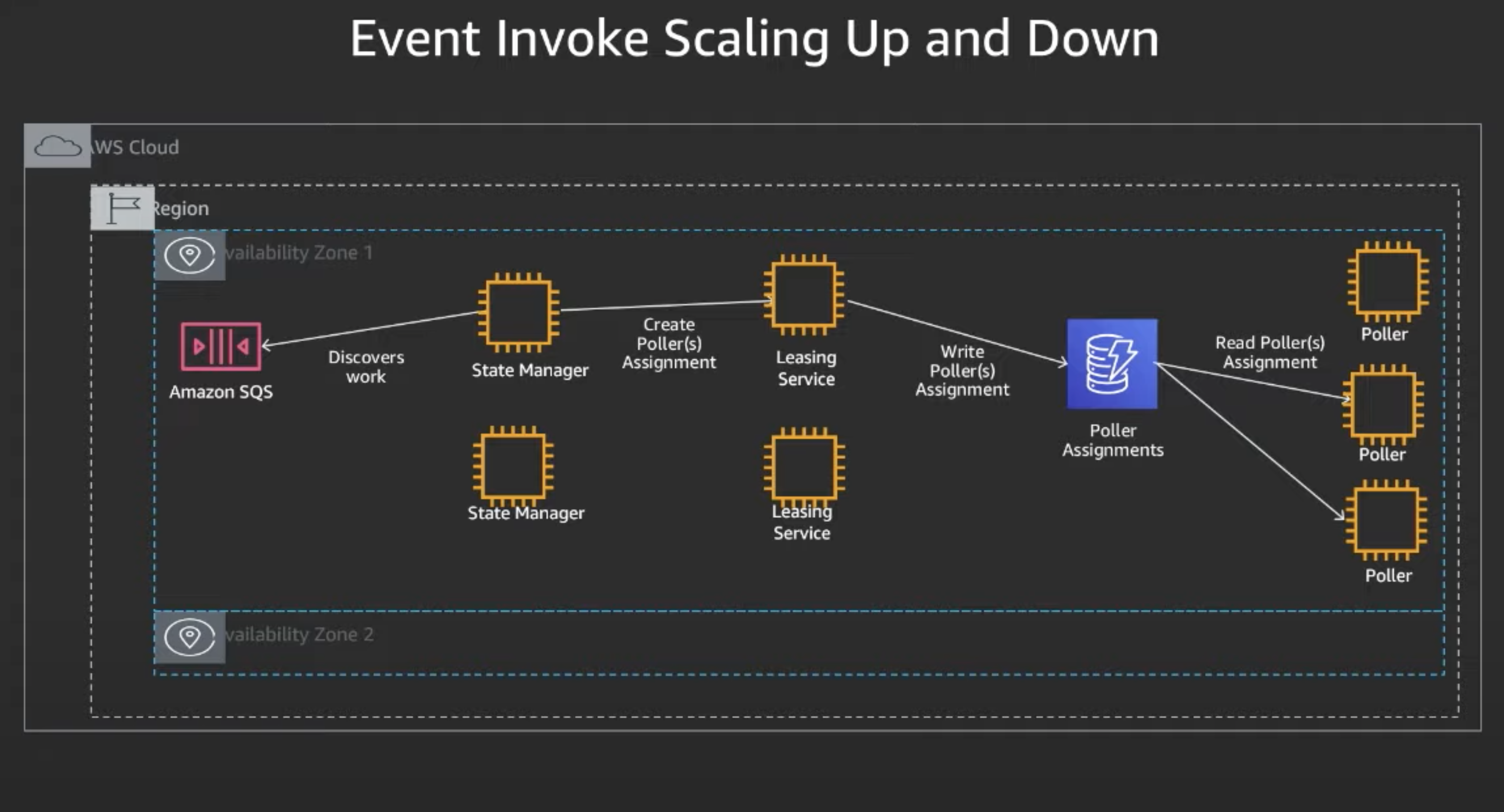 How lambda dynamically adjusts to process incoming event volume? This is where the State manager and leasing service comes in. Statemanager is responsible for scaling up queues and associated pollers to keep up with processing of events up to the concurrency configuration and leasing service is responsible for acuiqring and realsing assignments to pollers.
